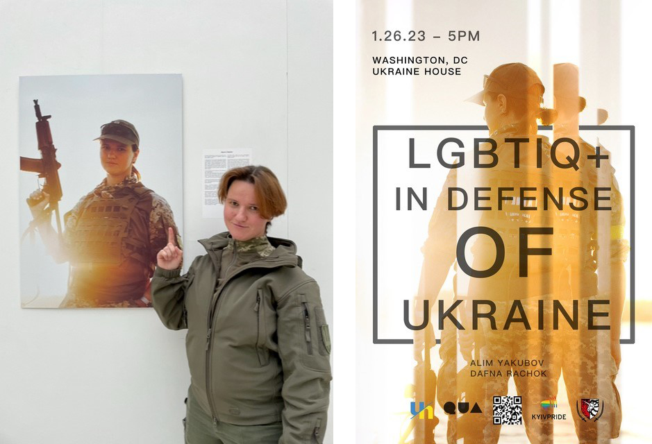 “LGBTIQ+ in defense of Ukraine” is framed as a conversation with LGBTIQ+ people who joined the military or became full-time volunteers after Russia’s brutal full-scale invasion of Ukraine. These people became defenders not just of their country but also of democracy and equality worldwide. All of them are risking their lives for a democratic and independent Ukraine and chose to stay and fight against the Russian occupation. This exhibition — featuring portraits taken by Alim Yakubov and personal stories collected and translated by Dafna Rachok — shows the unity and humanity of the Ukrainian people, including the LGBTIQ+ community. LGBTIQ+ Ukrainians have always been a part of Ukraine’s progress, and this fight for the survival of the nation is no different. We wish to highlight the resilience of LGBTIQ+ Ukrainian military and humanitarian volunteers.